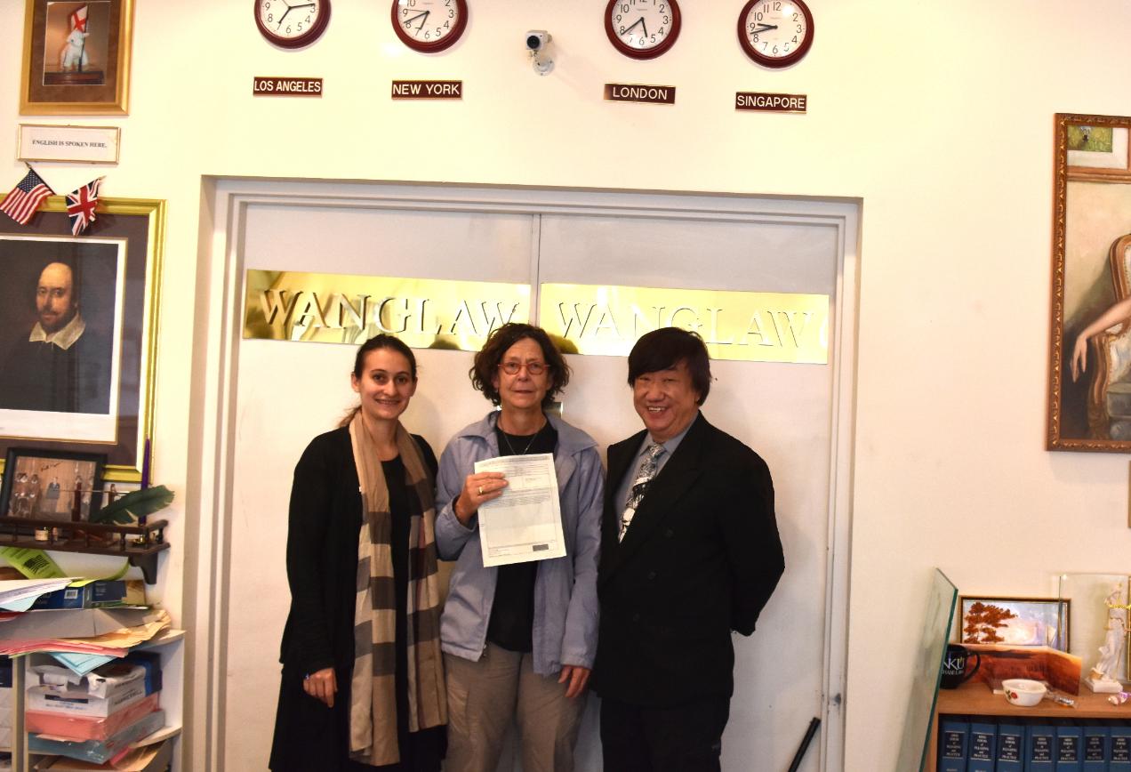 | NANCY SULLIVAN, AN HONORARY UNDOCUMENTED ALIEN PICKING UP USCIS DOCUMENTS AT WANGLAW - CONGRATULATIONS! |