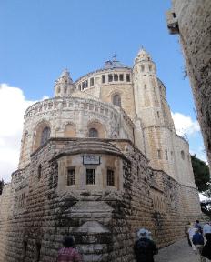 Hagia Maria Sion and the 11th century Franciscan Church of the Dormition, commemorating the "falling to sleep" of the Virgin. The modern stone building,